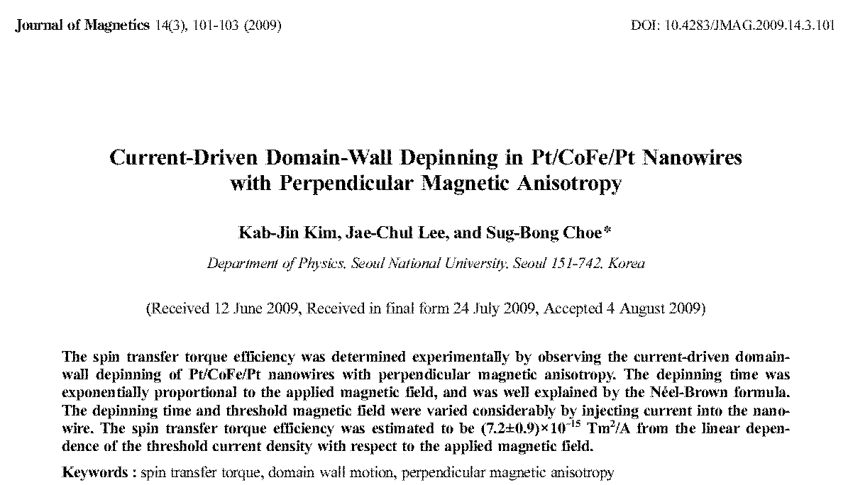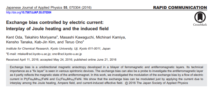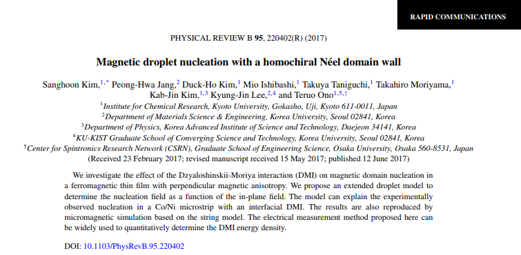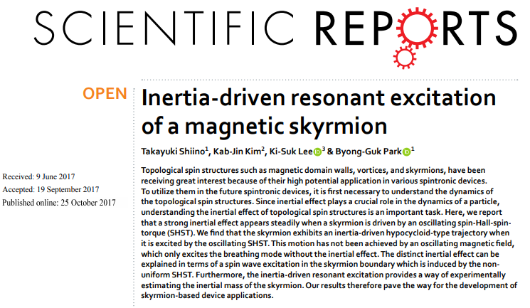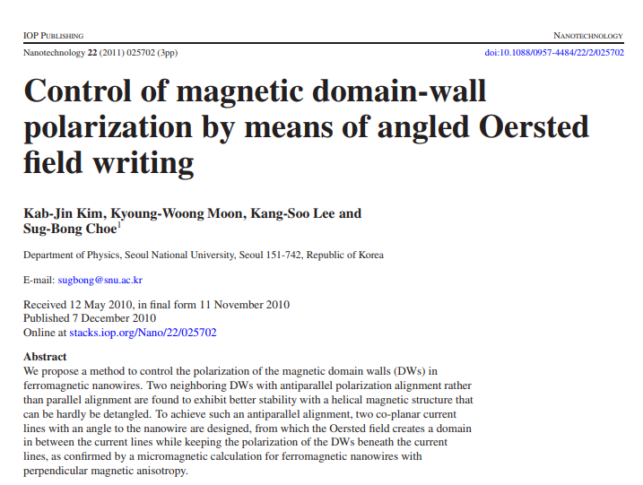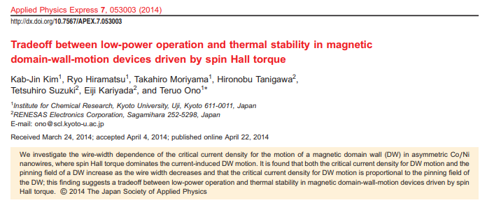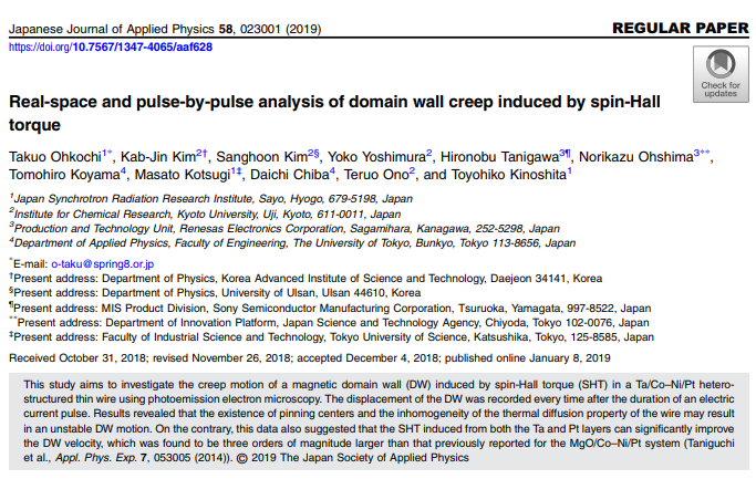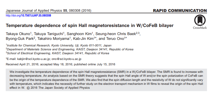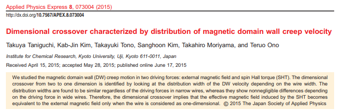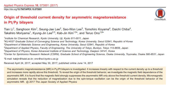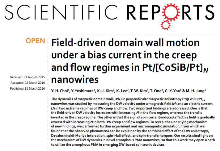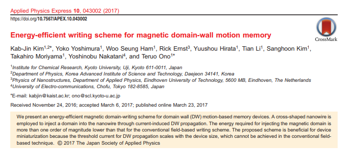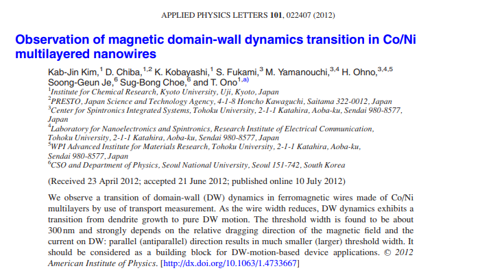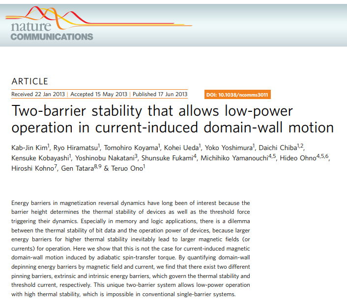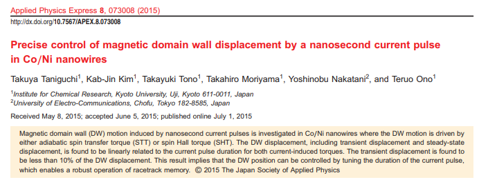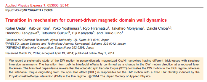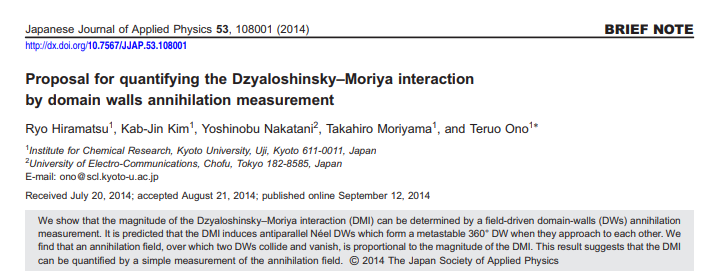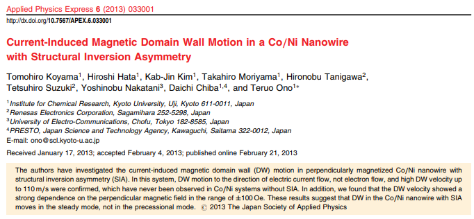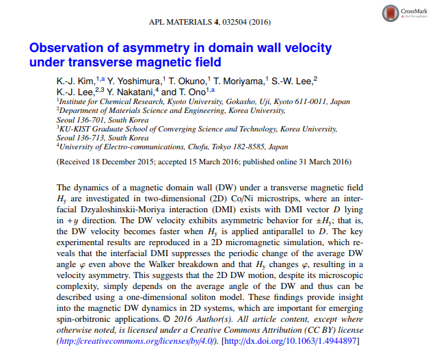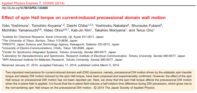 Takaya Okuno, Duck-Ho Kim, Se-Hyeok Oh, Se Kwon Kim, Yuushou Hirata, Tomoe Nishimura, Woo Seung Ham, Yasuhiro Futakawa, Hiroki Yoshikawa, Arata Tsukamoto, Yaroslav Tserkovnyak, Yoichi Shiota, Takahiro Moriyama, Kab-Jin Kim, Kyung-Jin Lee & Teruo Ono
