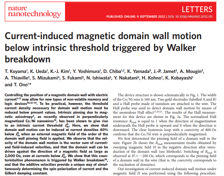 T. Koyama, K. Ueda, Kab-Jin Kim, Y. Yoshimura, D. Chiba, K. Yamada, J.-P. Jamet, A. Mougin, A. Thiaville, S. Mizukami, S. Fukami, N. Ishiwata, Y. Nakatani, H. Kohno, K. Kobayashi & T. Ono