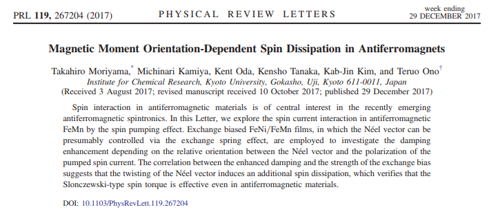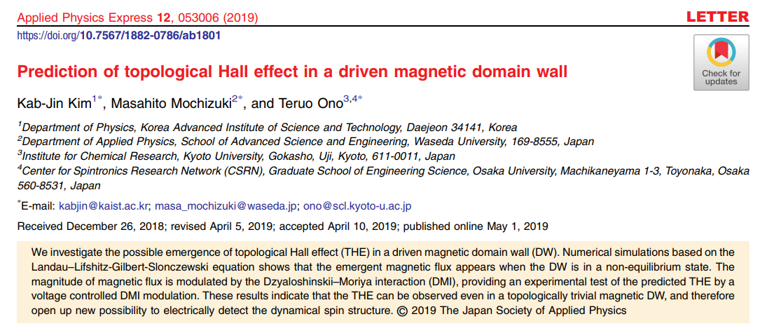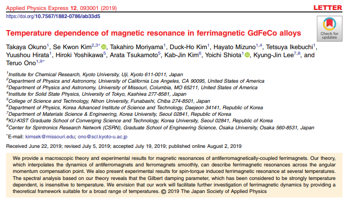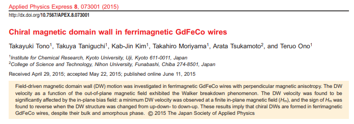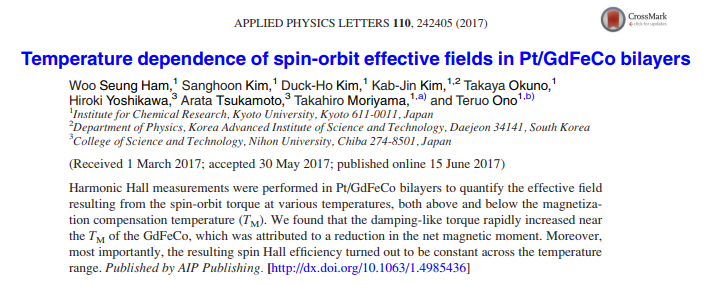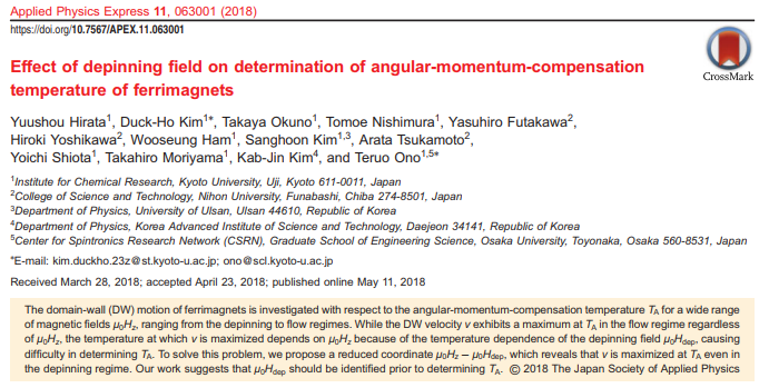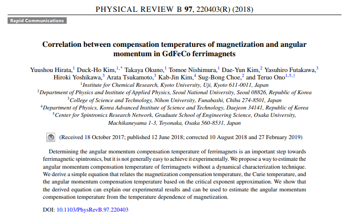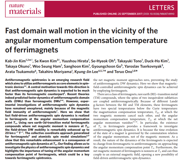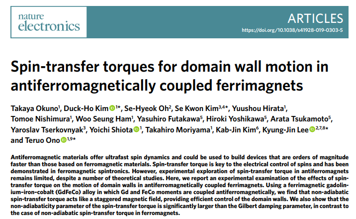 Takaya Okuno, Duck-Ho Kim, Se-Hyeok Oh, Se Kwon Kim, Yuushou Hirata, Tomoe Nishimura, Woo Seung Ham, Yasuhiro Futakawa, Hiroki Yoshikawa, Arata Tsukamoto, Yaroslav Tserkovnyak, Yoichi Shiota, Takahiro Moriyama, Kab-Jin Kim, Kyung-Jin Lee & Teruo Ono "Spin-transfer torques for domain wall motion in antiferromagnetically coupled ferrimagnets"