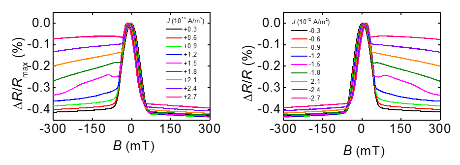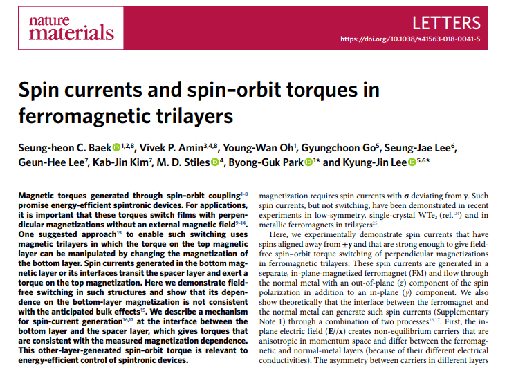 2011년경 3가지 획기적인 실험결과가 발표가 되었는데, 그 결과는 모두 Pt이나 Ta의 스핀홀 현상이 아주 크다는 것을 의미하는 것이었다. Miron과 Liu는 전류를 흘려서 자화 스위칭 실험을 하였고, 그 결과 Pt이나 Ta에 흐르는 전류에 의해서 Co가 스위칭된다는 것을 알아내었다 [참고문헌 1,2]. Haazen은 in-plane 자기장을 주면서 전류를 흘려 DW을 이동시키는 실험을 하였는데, 그 결과 역시 Pt의 스핀홀 효과에 의해 DW이 이동한다는 것을 나타내고 있었다 [참고문헌 3]. 이 말은Pt에서 스핀홀 현상이 발생해서 Pt과 Co의 계면에 한 방향 스핀이 모이고, 이것이 Co로 들어가면서 Co의 자화에 영향을 준다는 것이다. 지금은 누구나 알고 있는 이런 스핀홀 현상이 당시에는 막 등장하던 때였고, Rashba effect, DMI와 같은 계면 현상 역시 막 등장하던 때였다. 따라서 할 일이 많던 시기(?) 였기도 하다.