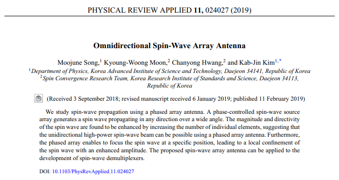 스핀파, spin wave는 자성체 내 스핀의 집단적인 떨림을 의미하는데, 간단히는 ‘자성체의 파동’이라고 이해할 수 있습니다. 이는 이중성을 가지고 있어서, 입자로서는 마그논(magnon), 파동으로서는 스핀파라고 불립니다. 도체를 가로질러 전자가 이동하는 전기 신호와는 달리, 스핀파는 인접한 스핀과 스핀 사이의 상호작용으로 마치 도미노처럼 전달되는 파동입니다. 따라서 정보 전달 시에 전류에 의한 줄열(Joule heating)이 최소화되어, 스핀파를 이용하면 기존 소자에 비해 매우 저전력으로 구동되는 소자를 만들 수 있습니다. 이에 수많은 스핀파 소자 연구가 진행되어 왔으나[1-3], 스핀파의 제어가 어렵다는 문제점이 있었습니다. 그 중 특히 스핀파의 진행 방향을 조절하는 것은 소자를 구현하는 데 핵심적인 부분이지만 물리적으로도, 공학적으로도 가장 도전적인 부분이었습니다. 이에 Y자 도파관을 만들어 스핀파의 경로를 선택한 연구[4], 줄무늬 자구 패턴을 자기장으로 변화시켜 스핀파의 방향을 전환한 연구[5] 등이 보고되었습니다. 그러나 이들 연구에는 영구적인 소자의 패터닝이 필요해 선택 가능한 방향이 제한되거나, 스핀파의 방향에 따라서 세기가 달라지고 자기장의 보조가 필요하다는 문제점이 존재합니다. 본 연구에서는 이러한 모든 문제를 해결할 수 있는 새로운 아이디어인 ‘스핀파 위상배열 안테나(spin wave phased array antenna)’를 제안합니다.
