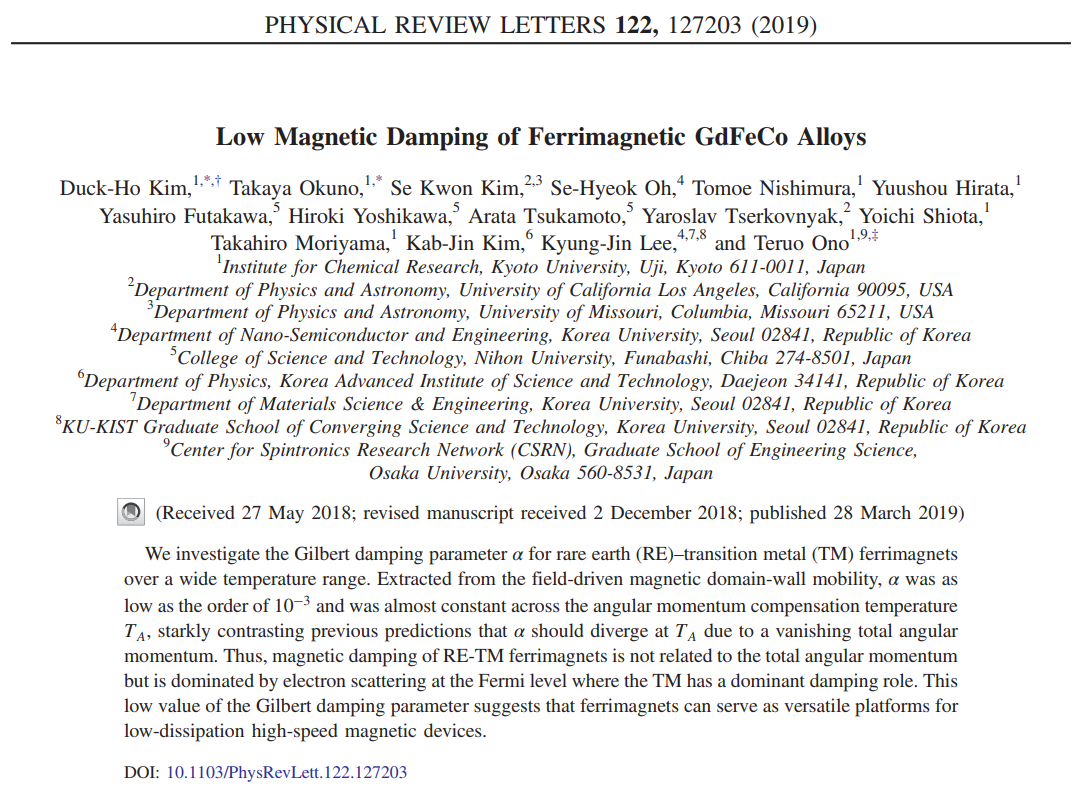 Duck-Ho Kim, Takaya Okuno, Se Kwon Kim, Se-Hyeok Oh, Tomoe Nishimura, Yuushou Hirata, Yasuhiro Futakawa, Hiroki Yoshikawa, Arata Tsukamoto, Yaroslav Tserkovnyak, Yoichi Shiota, Takahiro Moriyama, Kab-Jin Kim, Kyung-Jin Lee, and Teruo Ono "Low Magnetic Damping of Ferrimagnet GdFeCo Alloys"