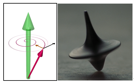 그림. (왼쪽) 외부 자기장 하에서의 스핀의 운동 (오른쪽) 지구 중력장 하에서의 팽이의 운동. (그림출처: UNIST 이기석 교수님)