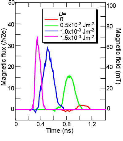 여기까지 읽고 이해가 되었다고 생각하면 안된다. 잘 생각해보면… 정말 엄밀하게 생각해보면… DW내부에 VBL이 생길 때는 항상 쌍으로 생기게 된다. 이 때 생기는 VBL쌍은 topological number가 +1/2, -1/2이 된다. 따라서 VBL이 생긴다고 해도, 발생한 topological Hall effect를 평균내면 0이 되어 버린다. 즉, 자구벽의 이동에서 topological Hall effect가 나온다고 하는 것은 뭔가 symmetry가 깨져있다는 것이다. 무엇이 이런 symmetry breaking을 줄 수 있나? 그것이 바로 DMI (Dzyaloshinskii–Moriya interaction)이다 (DMI에 대한 자세한 설명은 생략하자. 궁금하면 나를 찾아오라). 이걸 확인하기 위해서 DMI를 바꿔가면서 시뮬레이션을 해 봤고, 그 결과 DMI가 강해질수록 topological Hall effect가 커지는 것을 발견하였다 (아래 그림). 결론적으로 이야기하자면, DMI가 존재하는 시료에서 자구벽이 움직이게 되면, VBL이 비대칭적으로 생겨나게 되고, 그것이 바로 topological Hall effect를 발생시킨다는 것이다.