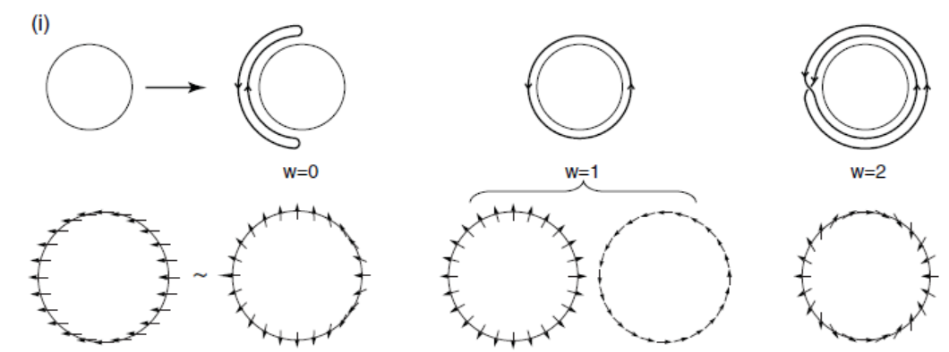 위 그림과 같이 “연속적인 변형을 통해서” 서로 변환되게 된다면 이는 위상학적으로 동등하다고 이야기 한다 (그래서 도넛과 컵은 위상학적으로 동등하다. 둘 다 구멍이 1개 있으니까). 그럼 자성학에서는 위상을 어떻게 이해할까? 한마디로 설명을 하자면, 자성체에서는 “real space에서 order parameter space로의 자화 벡터의 mapping”으로 위상을 정의한다. 간단한 예로 vortex의 경우를 예로 들어보자. 아래 그림에서 원주를 따라 있는 화살표가 자화이다. 원을 따라서 한 바퀴 돌 때, 화살표(자화)의 방향이 어떻게 바뀌는지 보자. 가장 왼쪽의 경우는 원을 따라 한 바퀴 돌아도 화살표는 한 바퀴 돌지 않는다 (그래서 winding number w=0으로 정의한다). 가운데의 경우 원을 따라 한 바퀴 돌았을 때, 화살표도 정확히 한 바퀴 돈다 (w=1이다). 오른쪽의 경우는 원을 따라 한 바퀴 돌면 화살표는 두 바퀴를 돌게 된다 (w=2). 이 때, winding number를 topological number라고 정의를 하고, winding number가 같다면 위상학적으로 동등하다고 한다. 위상학적으로 동등하다는 것은 연속적인 변형을 통해서 서로 바뀔 수 있다는 것이다(왼쪽의 두 개의 자화구조, 가운데 두 개의 자화구조는 서로 연속적으로 변환된다).