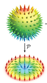 최근에 이슈가 되고 있는 스커미온 (skyrmion)의 경우 2차원 real space에서 3차원 order parameter space로의 mapping에 해당한다. 아래 그림과 같이 스커미온에 있는 자화(화살표)를 구의 표면에 mapping시키게 되면, 정확하게 구의 표면을 고슴도치처럼 꽉 채우게 된다.