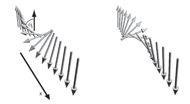현재 상황을 조금 더 자세하게 생각해볼 수 있는데, 아래 그림 8과 같이 모든 스핀이 정렬되어 있는 자성체에 스핀을 주입시키고, 그 스핀이 spin-flip을 일으켜서 자성체 내부의 스핀 하나를 뒤집는 것이라 생각할 수 있다. 그런데 자성체 내부에서는 같은 에너지라면, 스핀 하나가 돌아가는 대신에 전체 스핀들이 조금씩 기울어지는 것을 선호하게 된다 (스핀들이 손을 잡고, 하나만 돌아가지 않도록 막는 것이라고 생각하면 편하겠다).