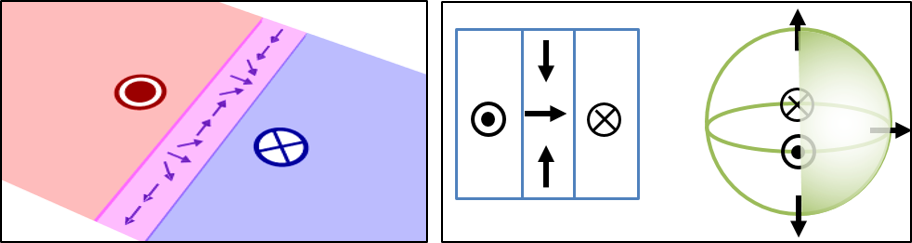 단순히 up에서 down으로 바뀌는 구조이고, 이 구조에서는 앞서 스커미온에서 정의한 topological number가 0이 된다. 즉, topological Hall effect가 나올 이유가 없다. 그런데 자구벽은 실제 1차원이 아니라 2차원에서 존재한다 (원자 하나를 이어서 1차원으로 만들 수 있다면 모르겠지만, 실제 우리가 사용하는 소자는 폭을 가지기 때문에 거의 항상 2차원이다). 2차원에서는 아래 그림과 같이 자구벽 내부에도 복잡한 스핀 구조가 존재할 수 있다 (이걸 vertical Bloch line (VBL)이라고 부른다). 이러한 VBL의 topological number를 계산해보면, 1/2이 나온다 (아래 그림에서 VBL의 자화를 구 표면에 mapping하면 정확히 절반이 꽉 차게 된다). 따라서 VBL이 존재한다면 topological Hall effect가 존재할 수 있다. 그럼 VBL이라는 것은 언제 존재하나? 바로 자구벽이 이동할 때 발생하게 된다. 그렇기 때문에 자구벽이 이동하게 되면, topological Hall effect가 나올 수 있는 것이다.