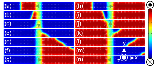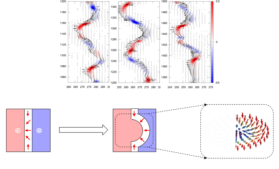 아래 그림은 자구벽이 움직이는 상황을 시뮬레이션 한 결과이다. 보다시피 자구벽이 움직일 때는 pinning으로 인해 지렁이처럼 휘게 되고, 휘는 곡점마다 VBL이 발생하게 된다. 이렇게 발생한 VBL은 아래 그림처럼 skyrmion의 절반인 half skyrmion과 같은 구조를 가지게 되고, topological Hall effect를 준다.