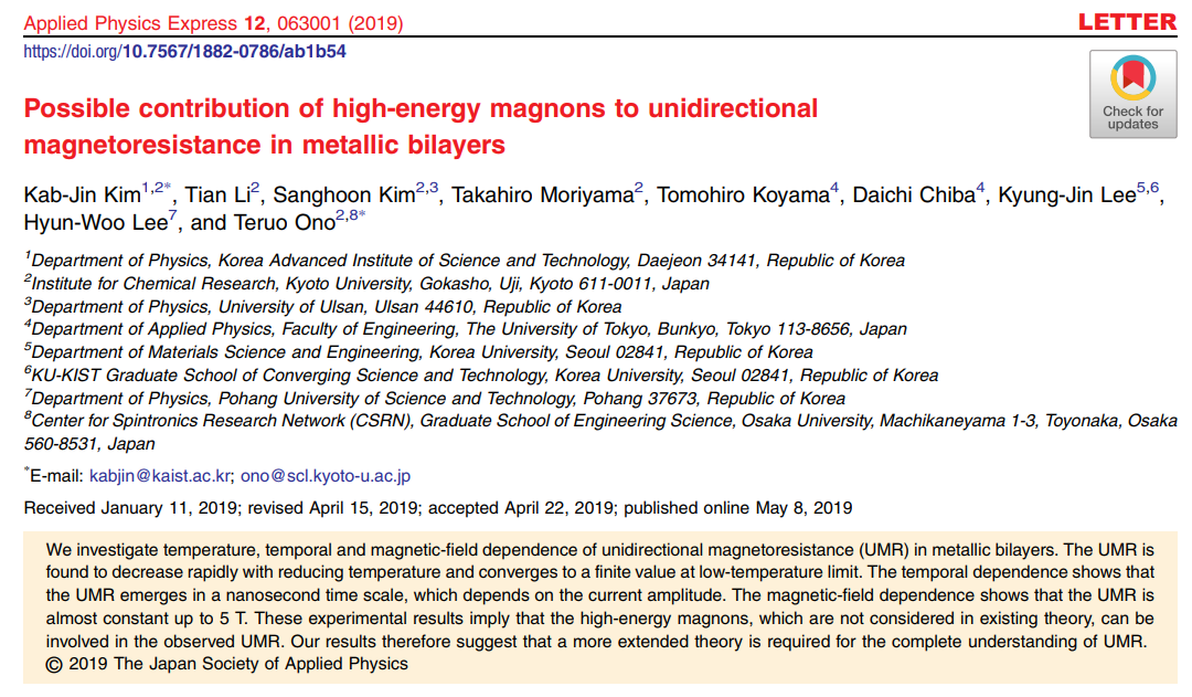 Kab-Jin Kim, Tian Li, Sanghoon Kim, Takahiro Moriyama, Tomohiro Koyama, Daichi Chiba, Kyung-Jin Lee, Hyun-Woo Lee and Teruo Ono "Possible contribution of high-energy magnons to unidirectional magnetoresistance in metallic bilayers"