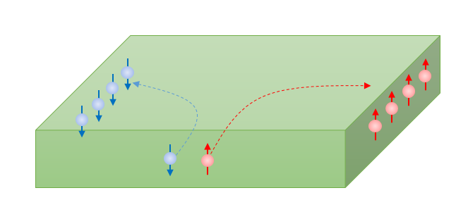 때는 2012년 9월 14일이었다. 나는 기억하지 못하지만, 내 실험 데이터에는 날짜가 기록된다 (그러니 이 것은 사실이다). 당시에 나는 Domain wall (DW) 실험을 열심히 하고 있었고, 그 즈음에는 ‘금속에서의 스핀홀 효과’라는 현상이 막 등장하던 시기였다. 스핀홀 효과라는 것은 전자가 이동할 때 그 스핀 방향에 따라 한쪽방향으로 휘는 현상이다. 야구공을 던지면서 스핀을 주면 휘는 것처럼, 전자가 스핀을 가지고 있으니 진행하다가 한 방향으로 휘는 것이다. 예를 들면, up-spin은 앞으로 가면서 왼쪽으로 휘고, down-spin은 앞으로 가면서 오른쪽으로 휘는… 그런 식이다 [그림1 참조].