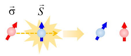 자, 그럼 energy transfer를 고려하면 어떻게 되어야 하는지 보자. 일단 스핀토크의 경우 두 스핀이 수직한 경우 그 효과가 가장 크지만, energy transfer의 경우 두 스핀이 평행/반평행 한 경우가 효과가 가장 크다. 단순하게 생각하면, 두 스핀이 반평행한 경우 longitudinal 성분이 직접적으로 교환될 수 있다. 우리는 이런 것을 spin-flip이라고 부른다. 다시 말하면, spin-up에서 spin down으로 바뀌는 것이다 (그림 7). 이런 현상을 지배하는 것은 교환상호작용 (exchange interaction)인데, 식으로 쓰면 $ \vec{\sigma} \cdot \vec{S} = \sigma_z S_z + \frac{1}{2} \left( \sigma_{+} S_{-} + \sigma_{-} S_{+} \right) $이 된다.