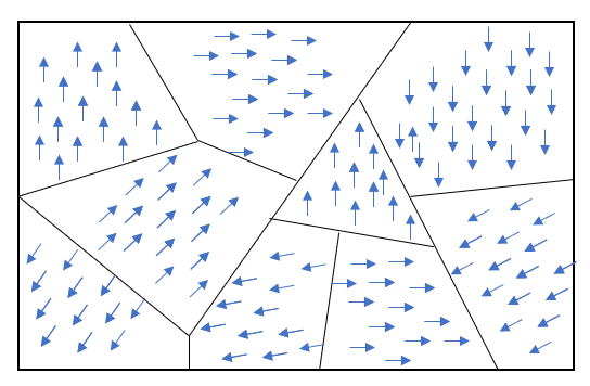 철이 자석으로 보이지 않는 이유는 철 내부 자화(스핀) 구조 때문이다. 철의 내부를 들여다보면, 아래 그림과 같이 여러 방향의 자화 구역들로 나누어진다. 이러한 구역을 우리는 자구 (magnetic domain)이라고 한다. 자구 내부에서는 모든 스핀이 같은 방향을 향하지만, 각각의 자구들은 무작위한 방향을 향하게 된다. 따라서, 겉에서 보면 모든 자구 방향이 평균내 져서 전체는 마치 특정방향을 가리키지 않는 것으로 보이는 것이다.