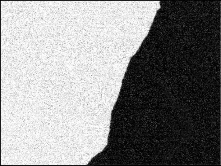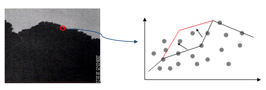 자구벽을 현미경으로 자세히 들여다보면 아래와 같이 그 경계가 구불구불한데, 그 이유는 시료 내부에 존재하는 결함 (pinning)때문이다. 즉, 자구벽이 반듯한 일직선일때보다, 결함들에 걸쳐있는 상태가 에너지적으로 더 안정하기 때문이다. 따라서, 자구벽은 구불구불한 모양을 가지게 되고, 이러한 자구벽은 여러 개의 segment가 연결되어 있는 것과 같다.