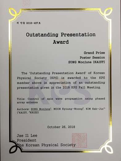 MooJune Song received outstanding presentation awards at 2018 KPS Fall Meeting! Congratulation~