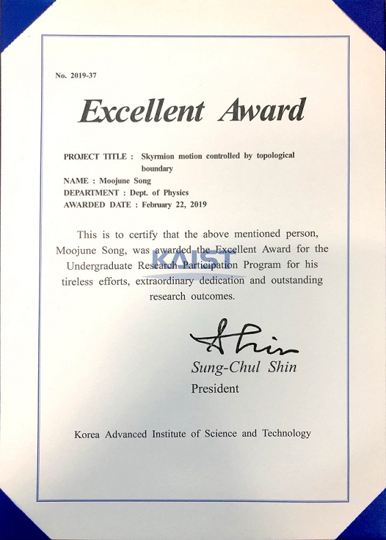 Moojune Song received "Excellent Teaching Assistant Award" from department of physics, KAIST! Congraturations!