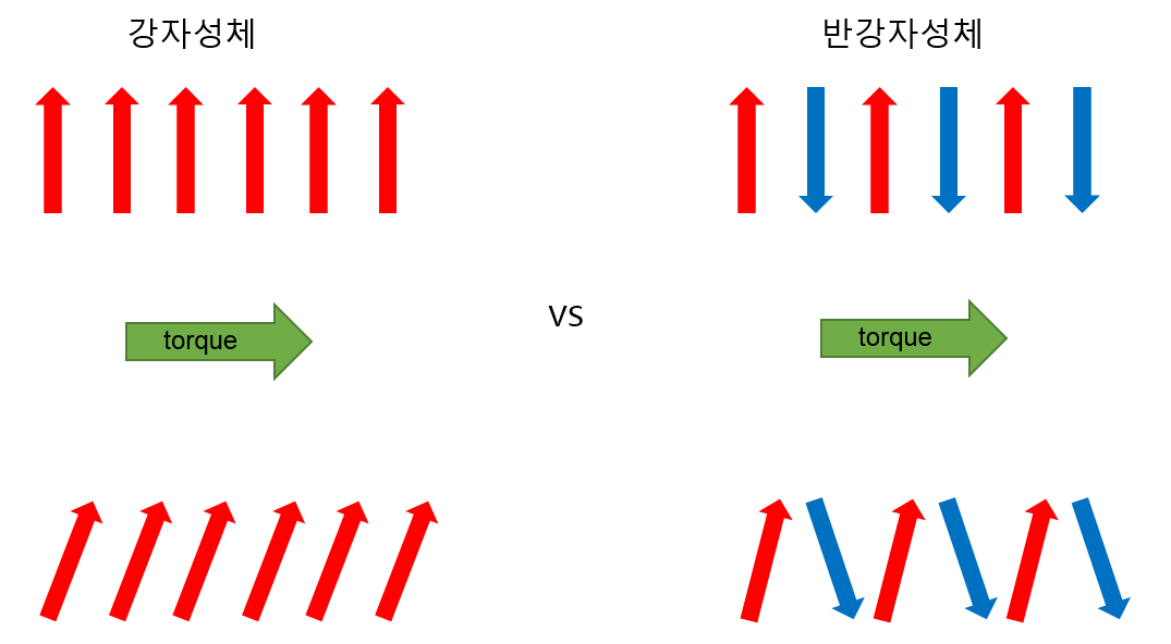 Figure 2. 강자성체와 반강자성체에 토크가 가해졌을 때의 변화