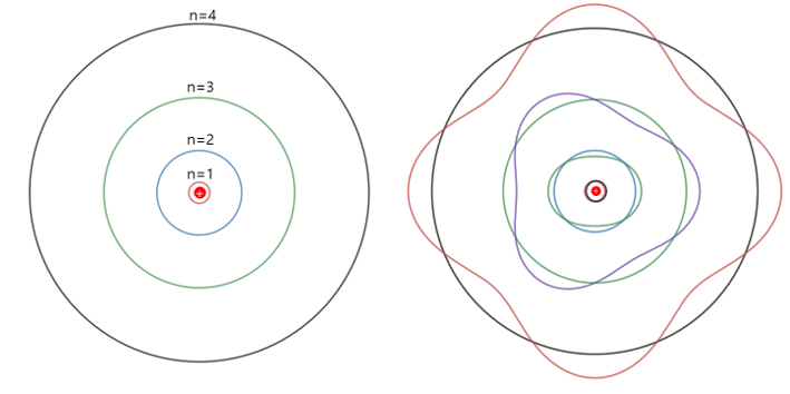그럼 이왕 원자까지 파고 들어간 김에, 원자가 어떻게 생겼는지 생각해보자. 원자를 쉽게 설명하는 모델로는 보어의 원자 모형이 있다 (그림 1). 이 모형에서는 원자핵이 가운데에 있고, 그 주위를 전자가 공전하는 듯한 형상을 취하고 있다(마치 태양계처럼). 양자역학이란 것을 조금 배운 사람은 보어의 모델에서 조금 더 나아가 드브로이 모델을 생각한다. 양자역학에서는 “입자는 곧 파동이요. 파동은 곧 입자라”는 언뜻 믿기 어려운 주장을 한다. 그 주장에 비추어 생각해보면, 전자는 입자인 동시에 파동일 수 있는 것이다. 파동이 원자핵 주위를 회전하기 시작하면, 살아남을 수 있는 경우는 바로 그 원궤도가 ‘정상파(standing wave)’를 이룰 때이다. 즉, 원자핵 주위에 형성된 전자의 정상파. 이것이 바로 드브로이 모델이다 (그림 2). 근데, 이런 원자가 왜 N극과 S극을 만들어내는 것일까?
