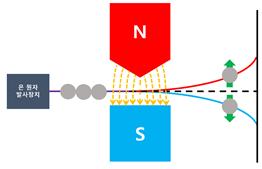 스핀을 이해하기는 어렵지만, 전자가 스핀을 가진다는 것은 실험적으로 명확하게 증명할 수 있다. 그것이 바로 슈테른-게를라흐 실험(Stern-Gerlach Experiment)이다. 슈테른과 게를라흐는 그림 6와 같이 자기장 구배가 있는 영역에 은(Ag)증기를 주입하는 실험을 수행하였다. 은이라는 원자는 앞 절에서 설명한 전자의 궤도 각운동량이 0인 물질이다. 따라서, 궤도 자기 모멘트도 없을 것이고, 자기장을 걸어줘도 별로 반응하지 않을 것이다. 그런데 놀랍게도 슈테른-게를라흐의 실험에서는 은 원자의 경로가 정확히 두 갈래로 갈라지는 현상이 측정되었다. 이 결과를 설명하려면, ‘자기장과 같은 방향의 자기모멘트는 자기장 방향으로, 반대 방향의 자기모멘트는 반대방향으로 휘었다.‘ 라고 해야 한다. 다시 말하면, 은 원자는 자기모멘트를 가져야 한다! 이것이 바로 스핀을 발견한 최초의 실험이다.