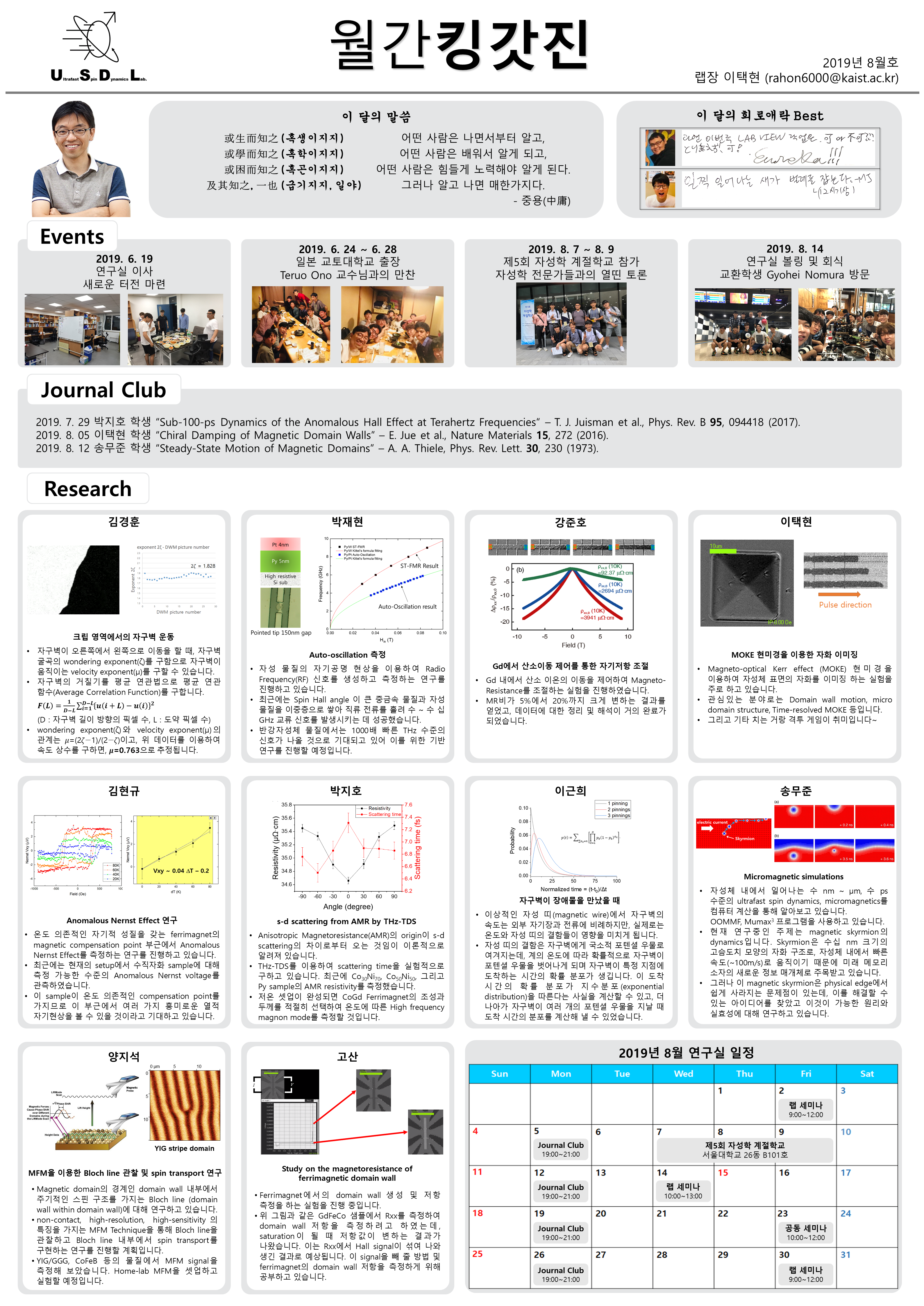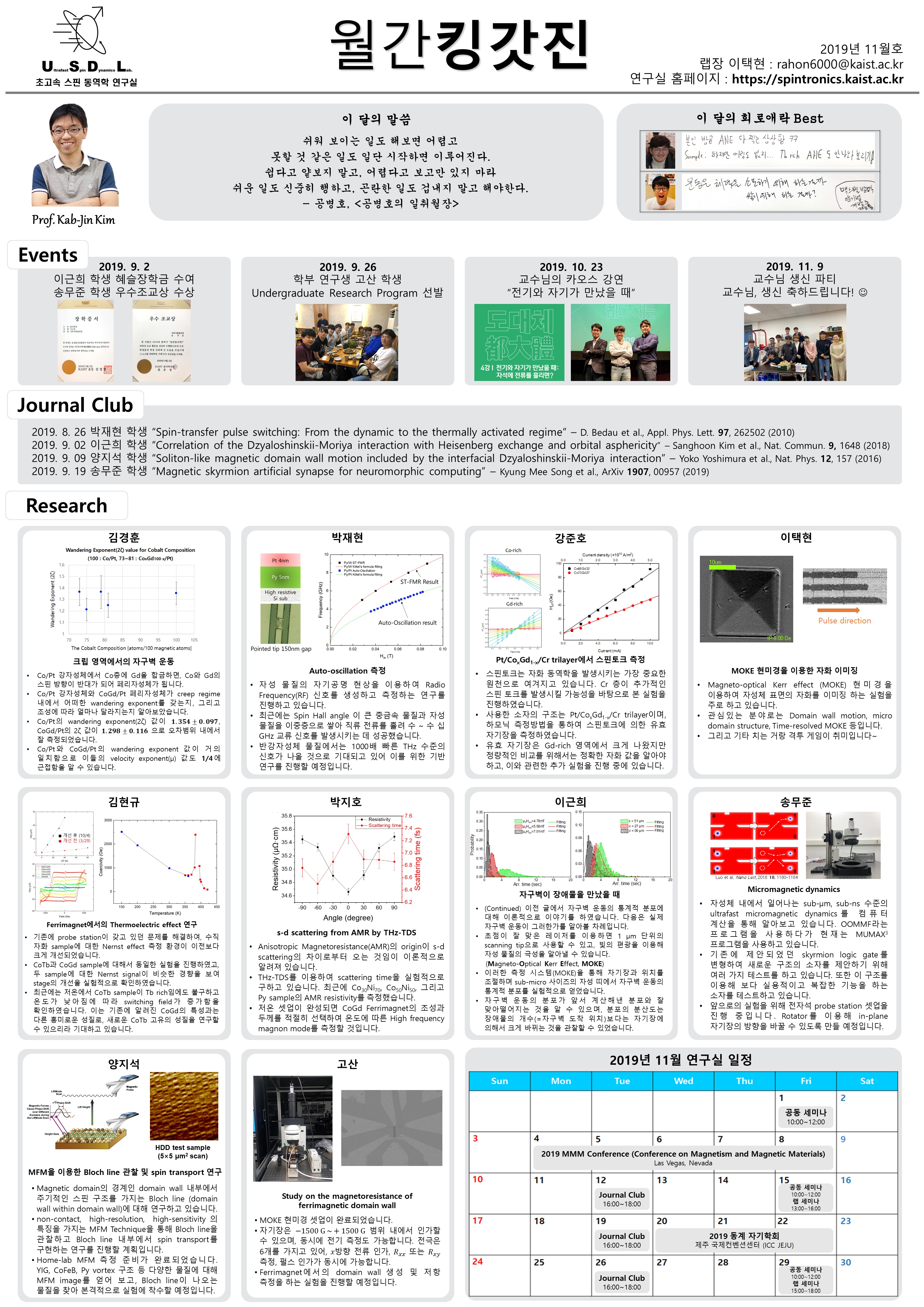 MIT와 IBM의 연구진은 자구벽의 스핀 방향이 x방향이라는 것을 증명하였고, 이렇게 x방향을 향하게 하는 메커니즘은 interfacial Dzyaloshinskii-Moriya interaction (줄여서, i-DMI)이라고 발표하였다(i-DMI가 궁금한 사람은 구글에 검색해보라. 구글신은 모든 걸 알고 있으니까) [7,8]. 사실 필자도 당시 같은 실험 결과를 가지고 있었으나, 기존의 이론에 너무 강하게 붙잡힌 나머지 새로운 사실을 발견하는 기회를 놓치고 말았다. 필자는 당연히 스핀은 y방향을 선호한다고 생각하고, 이를 바탕으로 결과를 해석하려고 애를 썼지, 스핀이 x방향을 향할 것이라고는 생각하지 못했다. 땅을 치고 후회해봐야 지나간 일은 지나간 일이다. 앞으로 또 그런 기회가 온다면, 그 때는 놓치지 않으면 되는거다.