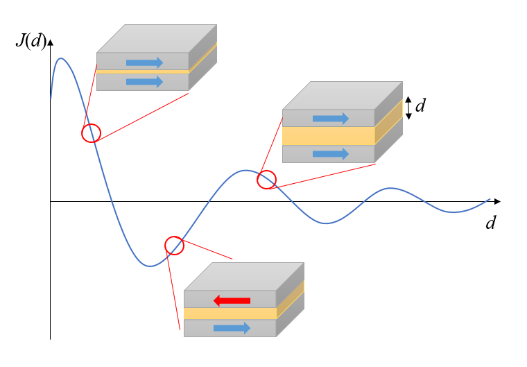 그림 1. 두 자성층 사이의 거리(d)에 따라서 스핀의 배열구조가 바뀌는 현상. RKKY 상호작용이 그 원인이 된다.