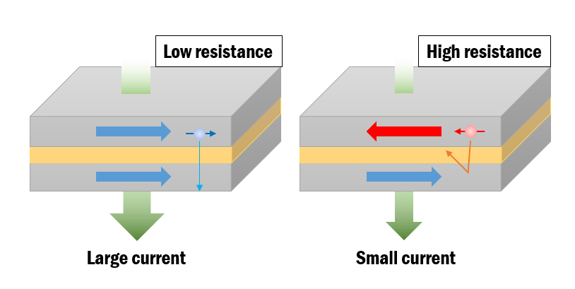 그림 2. 거대자기저항효과 (Giant magnetoresistance). 두 자성층이 평행할 때 전자가 잘 통과하여 낮은 저항상태가 되고, 두 자성층이 반평행하게 되면 전자가 산란되어 높은 저항상태가 된다.