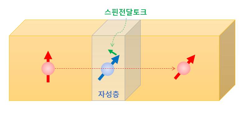 그림 3. 스핀 전달토크(spin transfer torque). 자성층의 스핀(파란색 화살표)과 평행하지 않은 전도전자 스핀(빨간색 화살표)이 주입되었을 경우, 전도전자 스핀은 자성층 스핀방향을 향하고, 자성층의 스핀은 반작용으로 전도전자 스핀 방향을 향한다. 즉, 스핀을 주입하면 자성층의 자화 방향을 제어할 수 있다.