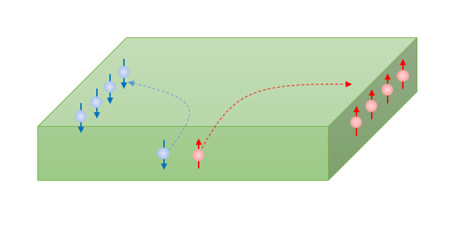 그림 5. 스핀홀 현상에 의해서 반대방향의 스핀은 반대방향으로 굽게 된다. 그 결과, 양쪽의 표면에는 오직 한 방향의 스핀만이 존재하게 된다 (100% 스핀 분극된 상태).