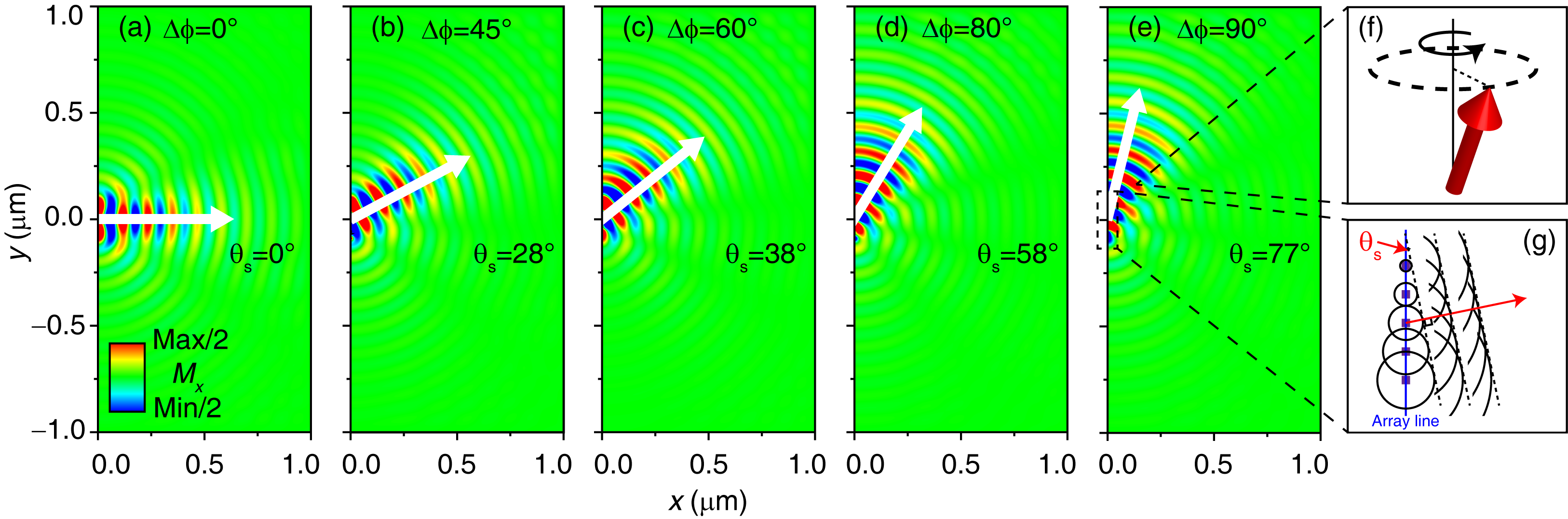스핀파는 위상(phase)이 존재하는 파동입니다. 이에 굴절, 간섭, 회절 과 같은 파동의 기본 성질에 의한 현상이 나타남이 이론과 실험을 통해 증명되었습니다[6,7]. 한편 위상배열 안테나(phased array antenna)는 5G 통신, 군사용 레이더 등에서 널리 쓰이는 개념으로, 인접한 파동 발생원 사이의 위상차를 조절함으로써 파동을 원하는 방향으로 전송할 수 있는 기술입니다. 인접 파원 간 위상차가 일정한 값으로 주어지면, 특정 각도에서 파동 간 보강간섭이 크게 일어나고, 이에 따라 한 방향으로 파동이 집중되어 진행합니다. 스핀파 또한 간섭 현상이 일어나므로 같은 원리가 적용될 수 있기에 스핀파에 위상배열 안테나 기술을 적용시켜 보았고, 이것이 가능함을 시뮬레이션을 통해 확인했습니다.