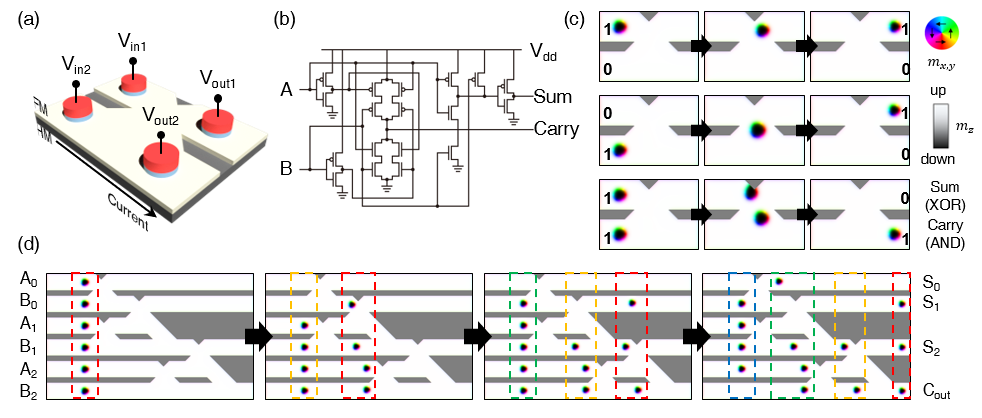 그림 1 스커미온 소멸을 이용한 논리 소자 (SA logic gate). (a) SA 반가산기 소자의 구조도. MTJ (Magnetic Tunnel Junction)로 이루어진 입출력 단자와 강자성체/중금속 이중층으로 이루어진 연산 부분(스커미온 진행 부분)으로 구성된다. (b) 기존 CMOS 기반 반가산기 회로도. 18개의 트랜지스터로 구성되나, 그 기능은 (a)와 동일하다. (c) SA 반가산기의 동작 과정. (d) 3-bit SA 가산기의 병렬 컴퓨팅 동작 과정. 빨강, 노랑, 초록, 파랑의 점선 상자로 표시된 입력 그룹이 순서대로 연산 처리된다.