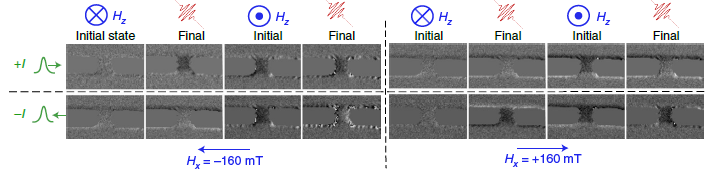 해당 이미지는 자기광 커 효과(Magneto-optic Kerr effect, 모크) 현미경으로 관찰하였다. 외부 자기장 방향과 바이어스 전압, 즉 펄스 인가 방향에 따라 스위칭 현상의 발현 여부가 관찰되는 것을 보아 스핀-궤도 토크에 의존적인 스위칭 현상이 발생하고 있음을 알 수 있다.