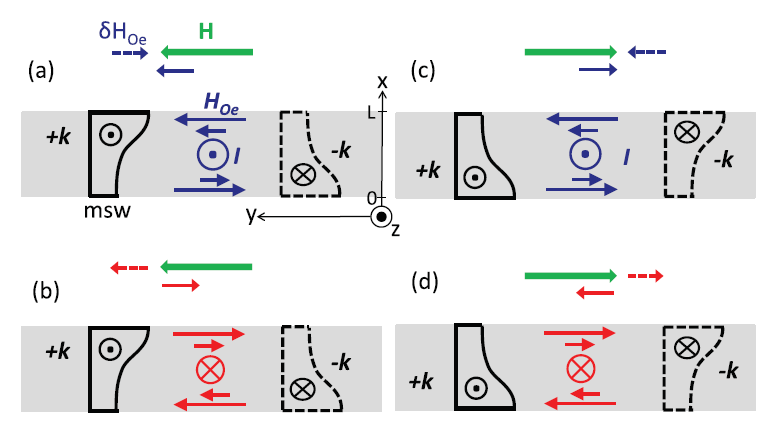 이 논문에서는 이를 정성적으로 설명하고[fig. 5], 또 새로운 spin wave 모델과 수식을 통해 정량적으로[fig. 6-8] 증명한다. MSSW 모드의 spin wave는 두께 방향으로 그 세기의 분포(modal profile)가 존재하고(한 쪽 표면에서 강하고, 반대 쪽 표면으로 갈수록 약해지는 비대칭적인 모양), 이는 k가 어느 방향인지에 따라 반대 모양으로 뒤집힌다(nonreciprocity). 이 때 자성체에 전류를 흘려 주면 두께 방향으로 세기와 방향이 변화하는 Oersted field가 샘플 전 영역에 펼쳐진다. 이 Oersted field는 한 쪽 표면에서는 외부 자기장 H (혹은 magnetization M)를 보강하는 방향, 반대 쪽 표면에서는 상쇄하는 방향으로 작용한다. 이 자기장의 변화는 spin wave의 frequency shift를 유발하는데, modal profile이 비대칭적이기 때문에 전체적인 frequency의 변화의 합이 0이 되지 않아 모든 위치의 frequency shift를 총합하면 일정량의 frequency shift가 남는다. 예를 들어 fig. 5(a)의 경우, 위쪽 표면에서는 자기장이 보강되는데, 이 쪽에서 +k의 세기가 강하므로 frequency가 상승된 양이 많고, 아래 쪽 표면에서는 세기가 약하므로 frequency가 하강된 양이 적게 되어 전체를 합했을 때 frequency가 상승하게 된다. 같은 매커니즘을 적용시켜 보면, 반대 방향의 k에서는 frequency 변화의 부호가 반대가 되며(odd), 전류에 대해서 odd, 자기장에 대해서 even한 대칭성을 갖는다는 것을 알 수 있다[fig. 5]. 이를 수식적으로 설명하기 위해서, 논문의 저자들은 exchange interaction의 항을 추가한 Damon-Eshbach (DE) model을 사용한다. 즉, Landau-Lifshitz (LL) equation의 effective field를 dynamic dipole field와 exchange field의 합으로 보고 식을 푼다. 그 결과로 얻은 식과 numerical calculation을 이용해 실험 결과를 설명한다.