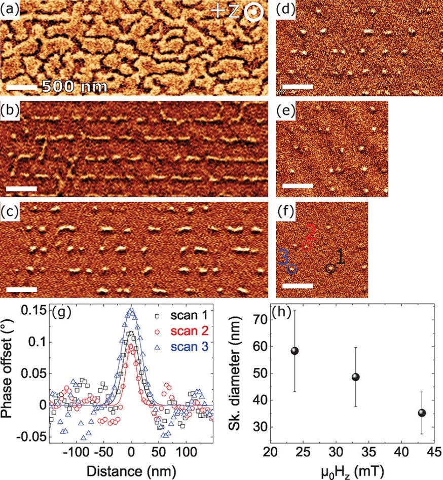 그 다음, 적절한 fluence를 채택하여 150 nm 폭을 갖는 직선 모양 영역에 He ion을 조사했다. 그리고 여기에 적절한 수직 자기장을 인가하며 MFM으로 magnetic domain을 측정하자, 낮은 자기장에서는 미로 모양 stripe domain들이 보이다가 수직 자기장이 증가하자 이 stripe들이 끊어지면서 알갱이 형태의 skyrmion이 생겨났다(Fig.2). 이 때 He ion을 조사하지 않은 영역의 Hk는 72 mT, He ion을 조사한 영역의 Hk는 7 mT로 측정되었다(Table 1). 이 때 수직 자기장을 키울수록 skyrmion의 지름은 작아지며, He ion의 fluence를 크게 할수록 skyrmion의 지름은 커졌다(Fig. 3). 이러한 stripe domain들이 skyrmion으로 바뀌는 과정을 mumax3를 이용한 micromagnetic simulation으로 모사해 같은 결과가 나옴을 확인했다.