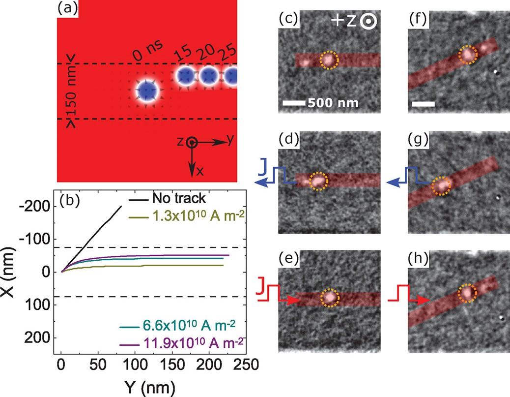 Skyrmion이 He ion으로 만든 track에 생성되는 것을 확인했으니, 전류를 흘려주어 skyrmion을 이동시켜 보았다. 6.6x1011 A/m2의 전류밀도, 11 ns width의 전류 pulse를 인가하자, skyrmion이 track을 따라서 이동했다. 전류 방향과 나란한 방향(0도)으로 만들어진 track에서는 skyrmion 속도가 35 m/s, 전류 방향과 22.5도의 각도를 갖고 만들어진 track에서는 60 m/s로 측정되었다(Fig. 4).