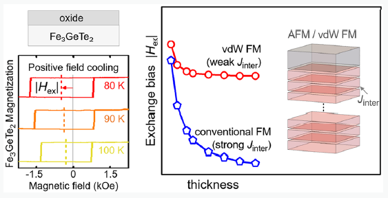 Exchange bias란 antiferromagnet과 ferromagnet 사이의 계면에서 일어나는 exchange coupling effect로, ferromagnet 층의 자화가 antiferromagnet의 영향으로 effective field를 느껴 hysteresis loop가 한쪽으로 shift 되는 현상을 말한다. 이러한 exchange bias의 방향은 antiferromagnet의 Néel vector 방향을 통해 조절할 수 있다. 즉, antiferromagnet를 Néel temperature 온도 이하로 cooling할 때 외부 자기장의 방향을 바꿔 줌으로써 exchange bias 방향을 조절해 줄 수 있는 것이다. 일반적인 3d 전이금속에서 exchange bias에 의한 exchange field는 강자성체의 두께에 반비례한다. 하지만 아래 그림과 같이 2차원 반데르발스 강자성체에선 그러한 법칙이 적용되지 않음을 볼 수 있다.