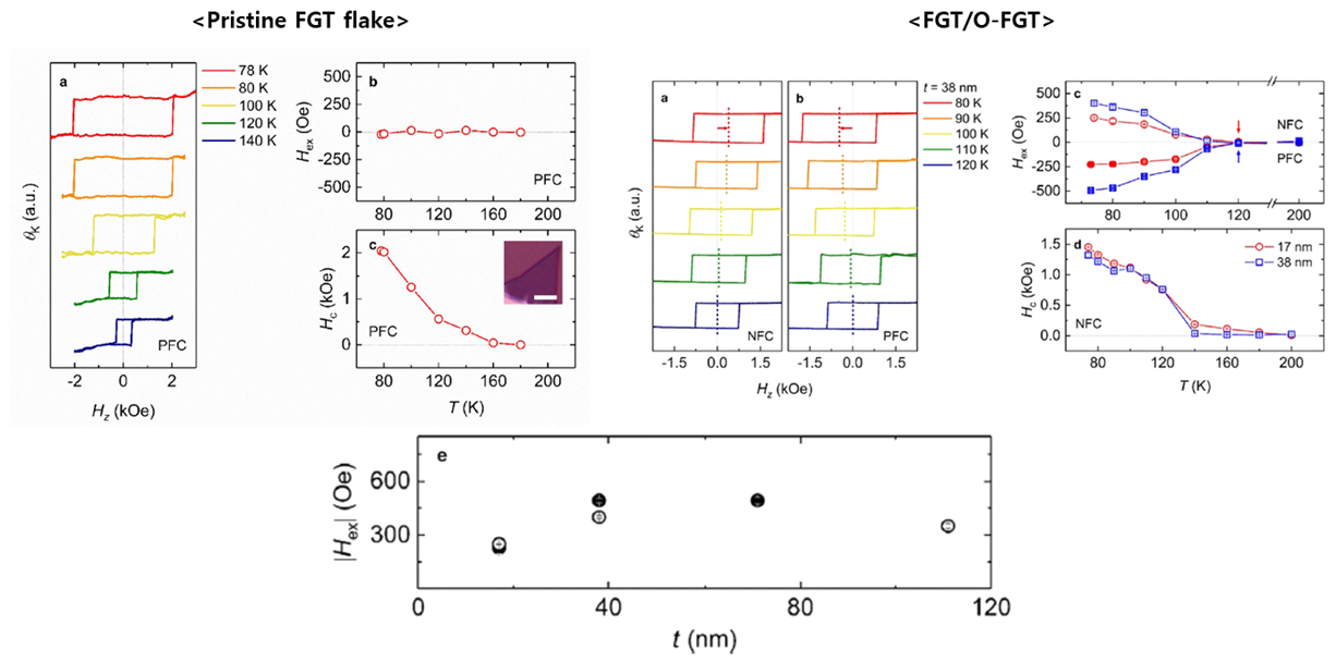 본 논문의 실험에선 ferromagnet(FM)층으로 FGT를 사용하였고 antiferromagnet(AFM)층은 산화시킨 FGT(O-FGT)를 사용하였다(산화된 FGT는 layered antiferromagnet으로 알려져 있다). 아래 그림을 보면 산화층이 없는 FGT와 비교하였을 때 확실히 exchange bias가 걸리고 있는 것을 볼 수 있다.