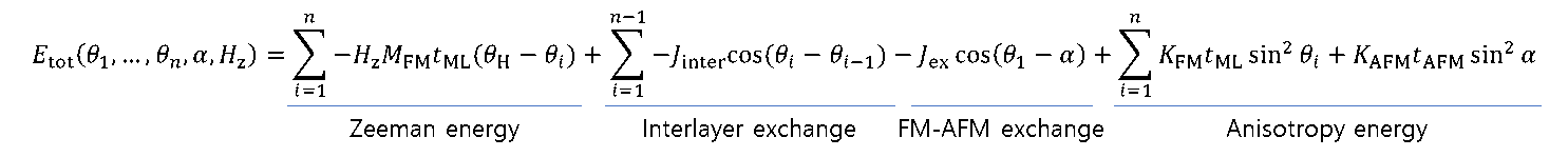 Hysteresis loop는 MOKE를 이용하여 측정하였다. PFC와 NFC은 각각 +z 방향과 -z 방향으로 약 1.5~2.0 T의 자기장을 주고 cooling 하였다는 의미다. PFC의 경우와 NFC 경우에 hysteresis loop의 shift 방향이 바뀌는 것을 볼 수 있다. 이는 AFM layer의 Néel vector의 방향이 바뀌어 exchange bias의 방향이 바뀐 것이다. 세 번째 그래프에서 보면 알 수 있듯이 exchange bias field가 자성체 두께에 반비례하는 것이 보이지 않는다. 본 논문의 연구진은 해당 현상을 설명하기 위해 시뮬레이션을 진행하였다. 시뮬레이션을 진행할 때 고려한 에너지는 아래와 같다.