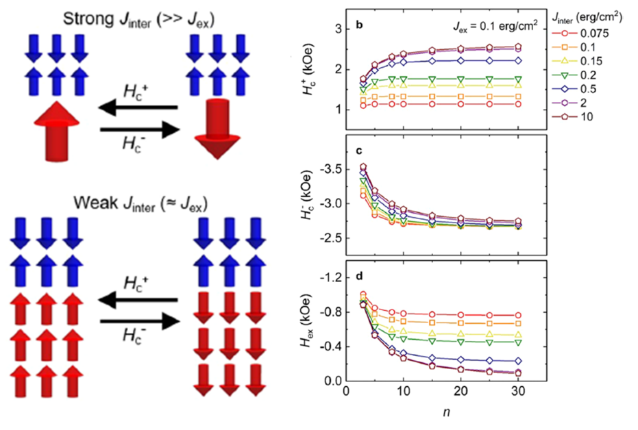 위 그림의 왼쪽 그림을 보면, Jinter가 클 경우와 작을 경우의 모델을 알 수 있다. Jinter를 Jex(AFM layer와 가장 가까운 FM layer 사이의 exchange coefficient)보다 매우 큰 경우(conventional 3d metal)와 비슷한 오더 수준의 경우(weak interlayer interaction model)로 나누어 설명하였다. 우선 Jinter가 Jex보다 매우 큰 경우엔 FM layer가 모두 한 몸으로 움직이기 때문에 비교적 자화가 뒤집히는 field가 크다. 하지만 Jinter가 Jex와 비슷한 오더에선 FM layer 사이의 interaction이 작아서, layer들 사이 interaction은 존재하지만 모두 한 몸으로 움직이진 않는다. 따라서 자화가 뒤집히는 field에선 AFM과 가장 가까운 FM layer가 먼저 뒤집히고, 나머지 아래 layer들은 field의 영향과 인접한 FM layer의 자화 상태에 영향을 받아 차례로 뒤집히게 된다. 이는 인접한 AFM layer의 자화가 바로 아래층 FM layer의 자화가 뒤집히기 쉽게 영향을 줄 수 있는 방향으로 정렬되어 있을 경우이고, 반대 방향으로 정렬되어 있다면 반대의 논의로 이해를 하면 된다. 상대적으로 두꺼운 자화층을 한번에 뒤집는 것보단 두꺼운 자화층이 한 층 한 층 차례로 뒤집히는 것이 더 적은 field에서 뒤집힐 것으로 예상할 수 있고 그에 대한 결과가 위 그림에서 보여진다. 이 데이터는 실험적인 데이터와 꽤나 잘 맞는다.