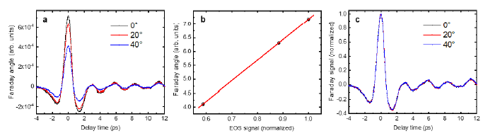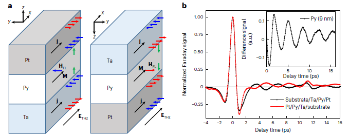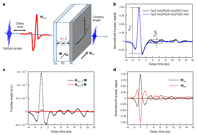 그림.1의 a처럼 THz 투과실험을 진행하였고, 크게 4가지의 실험을 통해서 SWR mode가 신호에 묻어나오며 SOT 메커니즘으로 설명할 수 있다는 것을 확인하였다. 먼저 첫번째는 symmetric 구조 (Ta/Py/Ta)과 asymmetic 구조 (Ta/Py/Pt)를 비교함으로써, spin hall angle의 부호가 반대인 asymmetric 구조를 통해 같은 방향의 spin이 Py의 계면에 쌓일때 SWR이 발생한다는 것을 확인하였다. (그림.1의 b) 가장 크게 나오는 신호는 Zeeman torgue signal (ZTS)로 Py에 직접적으로 가해지기에 두 구조에서 동일하게 나오지만, 뒤 쪽에 찌글찌글 묻어나오는 신호는 SWR 신호로 asymmetic 구조에서만 나오게 된다. 두번째는 외부 field 방향을 바꿈으로 Py의 자화방향을 THz light으로 생기는 field 방향과 수직, 평행하게 두어 magnetic 신호임을 확인하였다. (그림.1의 c) Py의 자화방향이 THz field에 평행할 경우, Zeeman torque는 당연히 발생하지 않고, SWR 또한 inplane 방향으로 electric field와 수직한 경우 SOT가 발생하지 않기 때문에 신호가 나오지 않는다. 마지막으로 SOT의 field like torque와 damping like torque의 영향을 확인하기 위해 외부 field 방향을 통해 Py 자화방향을 x축에 대해서 inversion을 가지게 해주었고, 신호의 위상변화를 통해 SOT의 field like torque가 주요 torque임을 확인하였다.(그림.1의 d) (LLG equation의 각 term을 확인해보면 쉽게 확인 가능하다.) 추가적으로 열적인 효과로 발생하지는 않는지 확인하기 위해 편광자를 사용하여 THz field 크기에 대한 경향성을 확인하였고, linear한 감소를 보임에 따라 열적인 효과가 아닌 것또한 확인을 하였다. (그림.2)
