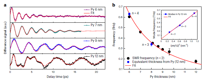 Py 두께에 따라서 time delay signal이 달라지게 되는데, 각 두께에 따라서 magnon dispersion 식으로 계산을 하면, n=2 mode의 정상파가 생기는 것을 확인할 수 있다. d=12nm의 경우, 다른 두께에 비해 찌글거림이 있는 것을 확인할 수 있는데, cos 함수 decaying으로 분석을 하면 총 3가지 모드가 묻어나오는 것으로 확인된다. (n=2, 3, 4) 최종적으로 magnon dispesion 식을 사용해서 fitting을 하면, 원하는 형태 (그림.4의 b)로 잘 fitting되며, Py 물질 값도 잘 유도 된다. (자세한 과정은 연락드립니다.) 12nm의 경우와 나머지 경우에서 묻어나오는 mode의 수가 다른 이유는 빛의 penentration depth가 약 10~15nm로 나머지는 penentration depth보다 작다보니 낮은 mode가 보이지 않게 되는 것이다.