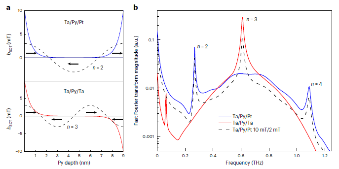 시뮬레이션으로 SOT 기반 모델 (그림.3의 a)이 정당한지 확인을 해보면, 그림.5와 같다. asymmetric한 구조의 경우, SOT로 생기는 field 방향이 동일하기 때문에 짝수 mode의 정상파만 형성이 되고, symmetric한 구조의 경우, field 방향이 반대 방향이어서 홀수 mode의 정상파만 형성이 된다. (그림.5의 b참조) 그러면 왜 symmetric한 구조에서 아무것도 나타나지 않았는가? 에 대한 답은 2ps내에서 counter-propagating coherent spin wave로 인해서 cancel out되기 때문이다. 실제 실험에서 12nm의 경우는 n=2, 3, 4가 묻어나왔는데, 이는 SOT로 형성되는 자기장의 크기가 서로 다르기 때문에 발생하는 것이다. (그림.5의 b에서 검은색 점선 참조)
