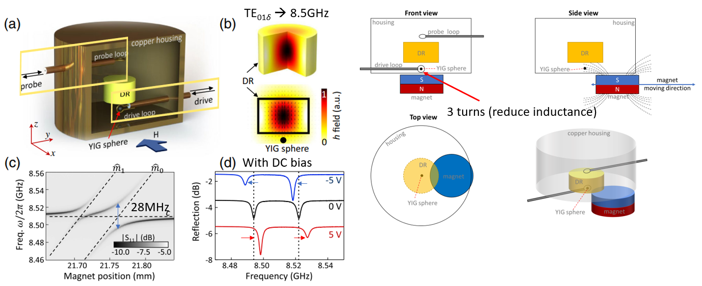 본 논문에서 진행한 실험 셋업은 그림.1과 같다. Cooper housing을 통해서 radiation loss를 최소하시켰고, 기본적으로 dielectric resonator (DR)와 YIG sphere를 coupling 시켰다. probe loop을 통해서 DR에 RF field를 가해주고, TE01δ모드를 형성해준다. (이때, resonance frequency는 대략 8.5GHz이다.) YIG sphere의 경우, DR의 바로 아래쪽에 위치해있고, 외부 field는 그림.1에 (a)처럼 x방향으로 가해진다. (오른쪽 편 그림처럼 영구자석의 위치를 변경해가면서 field의 크기를 조절한다.) YIG sphere근처로는 driving loop가 감겨 있는데, 이것이 floquet engineering의 source이다. driving loop에 신호를 흘리지 않고, 단순하게 coupling을 본 그래프가 그림.1의 (c)이다. (magnon mode가 두 개가 묻어나오지만, 이 중에 m0모드에 집중적으로 실험을 진행하였다.) coupling이 잘 발생하는 것을 확인하고, driving loop에 DC bias를 가하면서 각 resonance가 어떻게 변하는지 확인한 결과가 (d)의 그림이다. 각각의 세기마다 resonance peak이 shift하는 것을 볼 수 있다.